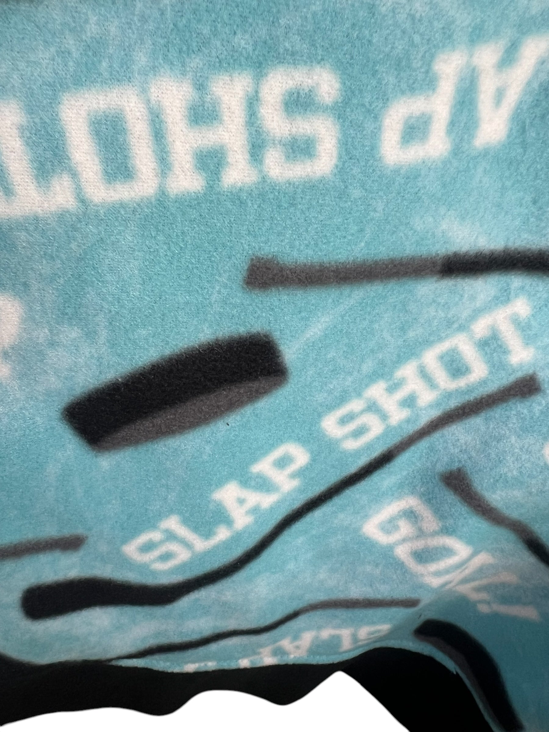 This poncho is light blue with images of black hockey sticks and pucks. It has white writing and a black lining