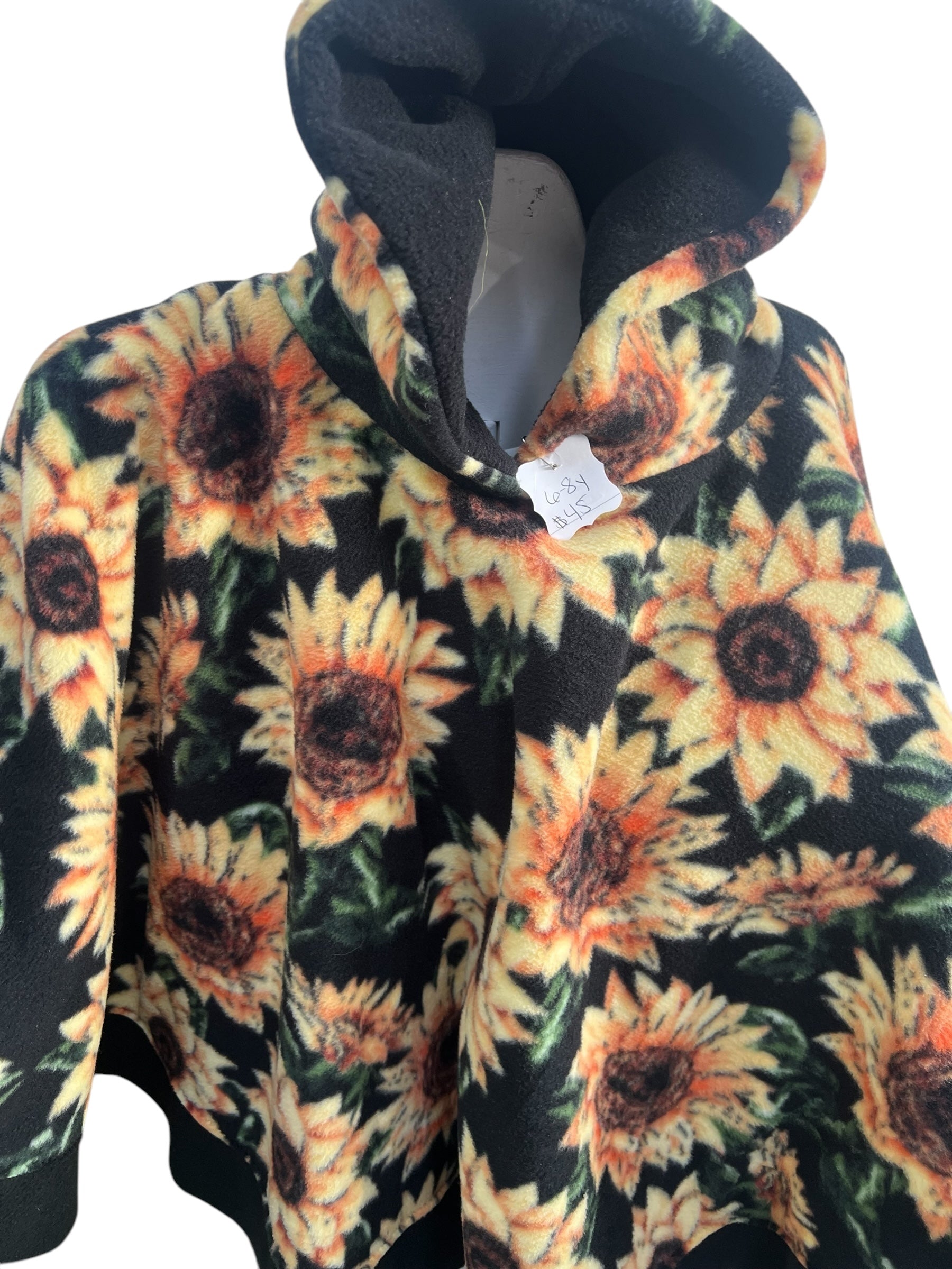 This poncho has a black background with beautiful sunflowers with a black lining.
