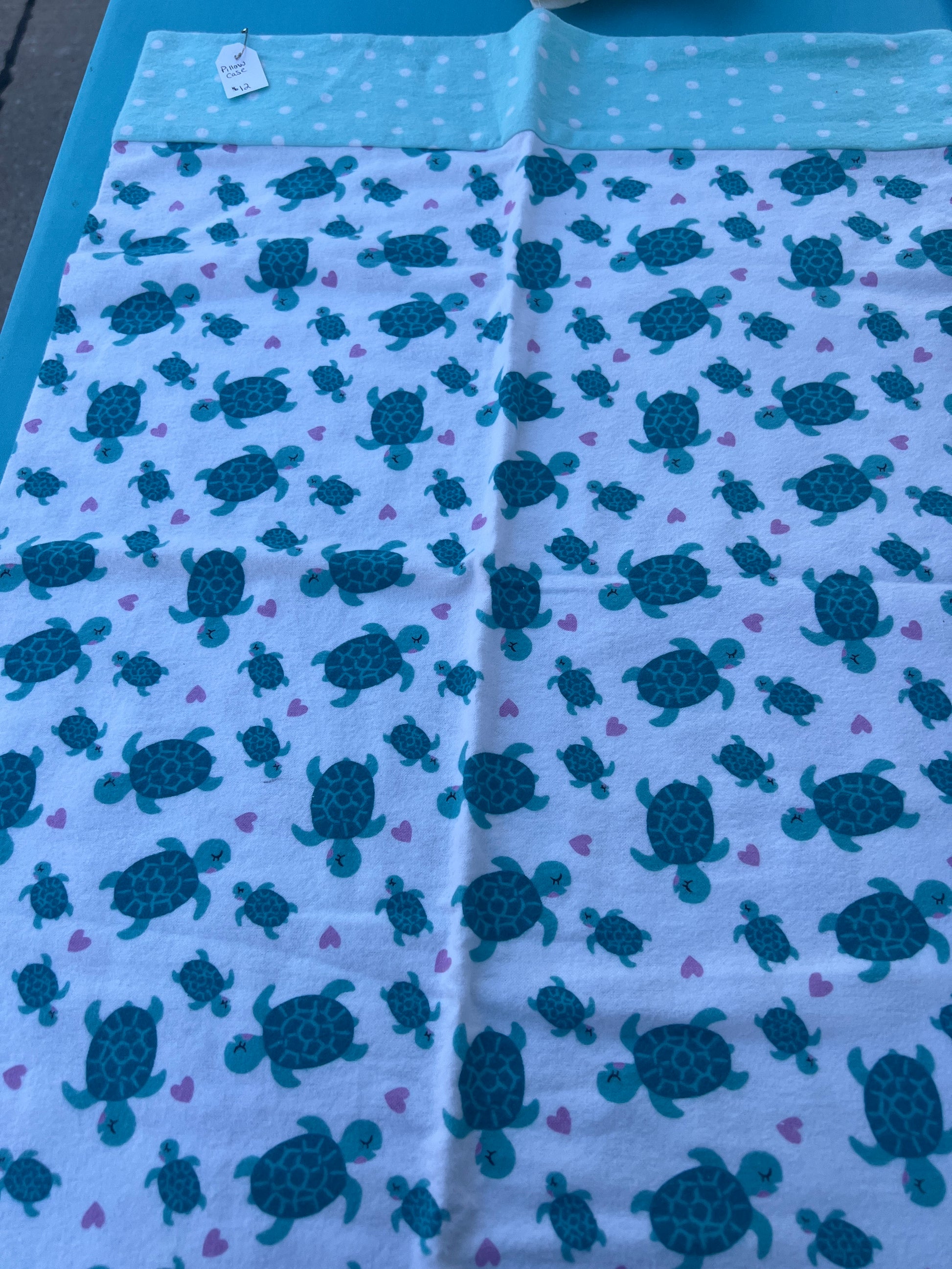 The pillow case was made with teal turtles, some small and some big. It also has pink hearts. The pillow case is made out of flannel and has an opening on the top. It is washer and dryer safe.
